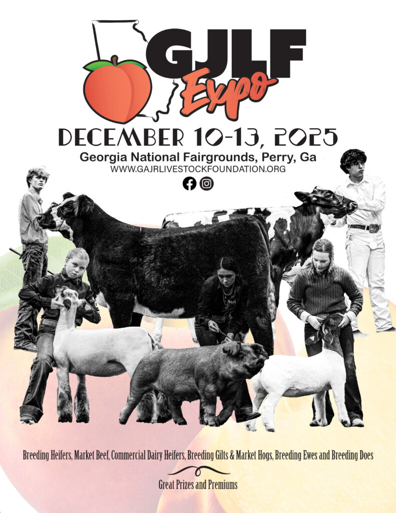 We are thrilled to announce that GJLF will host the 2025 GJLF Expo, Dec. 10-13, 2025, in Perry, Ga. The show is a multi-species show for cattle, swine, breeding ewes, breeding does and commercial dairy heifers. The Expo will be open to exhibitors across the country. For GJLF Expo questions, contact Josh Whitworth at 229-254-4746.